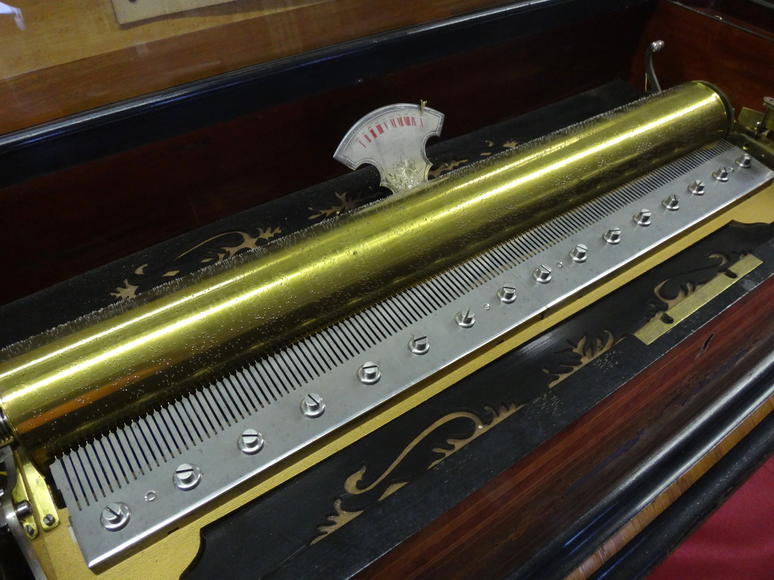 Baker Overture Music Box was manufactured in Switzerland around 1875. For perspective, U.S. Grant was the American president at the time. This is a cylinder machine, and an example of the beautiful craftsmanship that went into these machines. The music is read off of the brass cylinder, similar to the barrel organs. If you look closely, you will see hundreds of tiny hand-set pins that strike the musical comb, which is visible in the front of the brass cylinder. The music box plays ten songs – each song is one rotation of the cylinder, after which it shifts very slightly to play the next song.